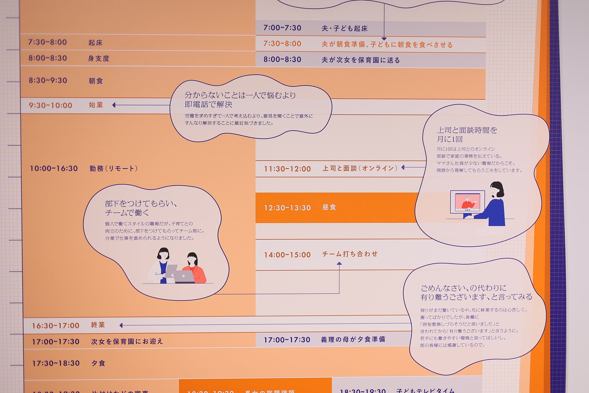 スケジュールとともに、正社員ワーママ達から集めた、多様な「仕事と子育てを両立するための工夫」も展示しています。多忙な中で、仕事の効率化や職場の同僚・上司との関わり方、将来のキャリアにつながるような取り組みに加え、家事の時短術や子どもとの時間のつくり方、息抜き方法などの日々の過ごし方の参考になる工夫も展示しています。