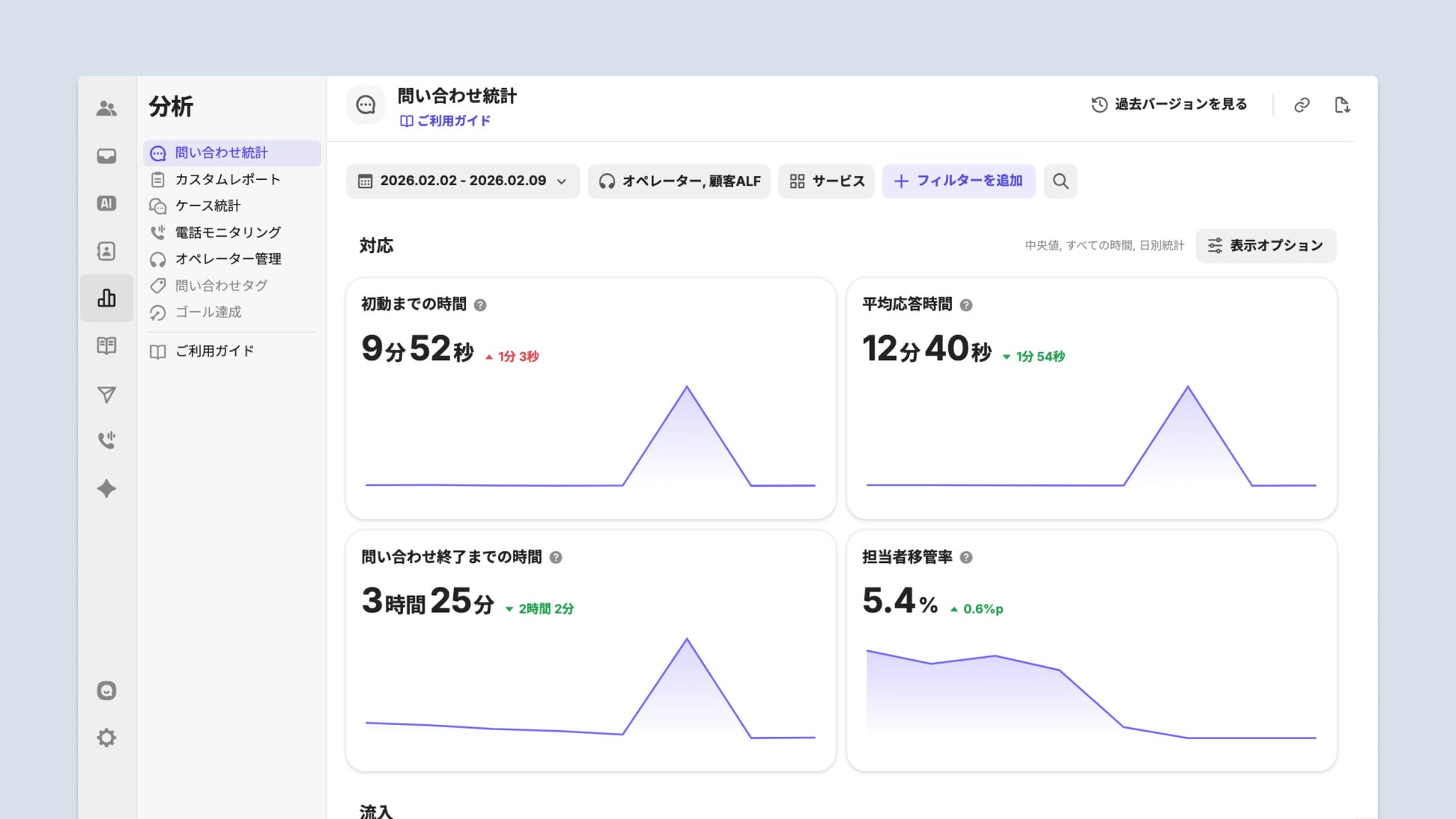 従来の「オペレーション」メニューを「分析」へ刷新し、問い合わせ統計機能をアップグレードしました。AIエージェント「ALF」が応対した問い合わせも統計に含めて集計できるようになったため、AIによる業務負担軽減の効果測定や、運用最適化のための意思決定をより精度高く行えるようになります。