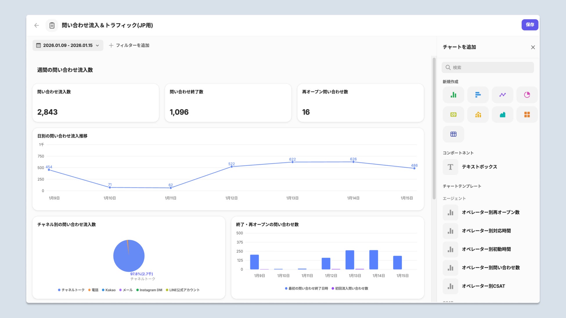 本アップデートでは、顧客のビジネス状況に応じたカスタマイズされたデータインサイトを提供し、パーソナライズされたダッシュボードの構成を実現しました。さらに、AIエージェント「ALF」による自動応対を含む問い合わせデータをカスタマイズで可視化できるようになり、人とAIの対応状況を横断的に把握することもが可能になりました。AIによる業務効率化の効果測定や運用最適化の意思決定を、企業毎のKPIよりデータに基づいてデータ分析を行える環境を実現します。