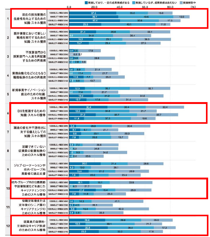 ⇒個人のキャリアや事業の転換につながる取り組みが本格化していくと見られるが、成果 実感につなげるには一層の工夫が求められそうである。