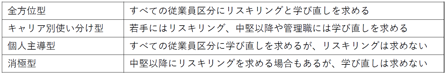 ・会社主導の「リスキリング」と個人主導の「学び直し」を、どのような対象に求めているか尋ねたところ、そのパターンから4タイプが見出された。