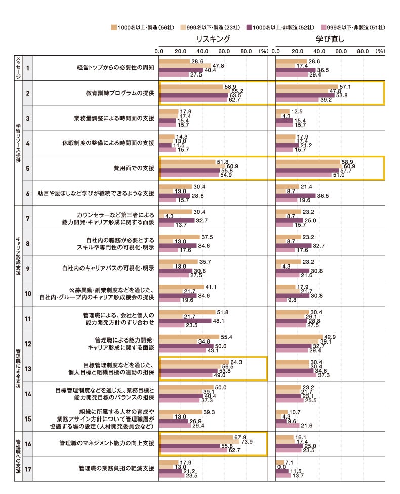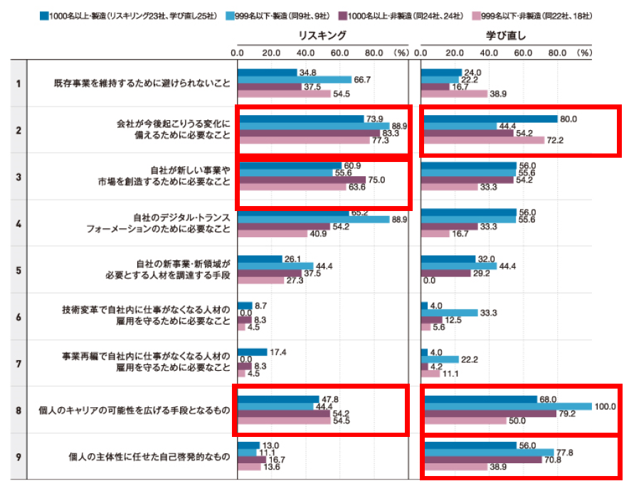 ⇒これらは「学び直し」中心の<個人主導型>では選択率が低く、「リスキリング」推進の要点と考えられる。