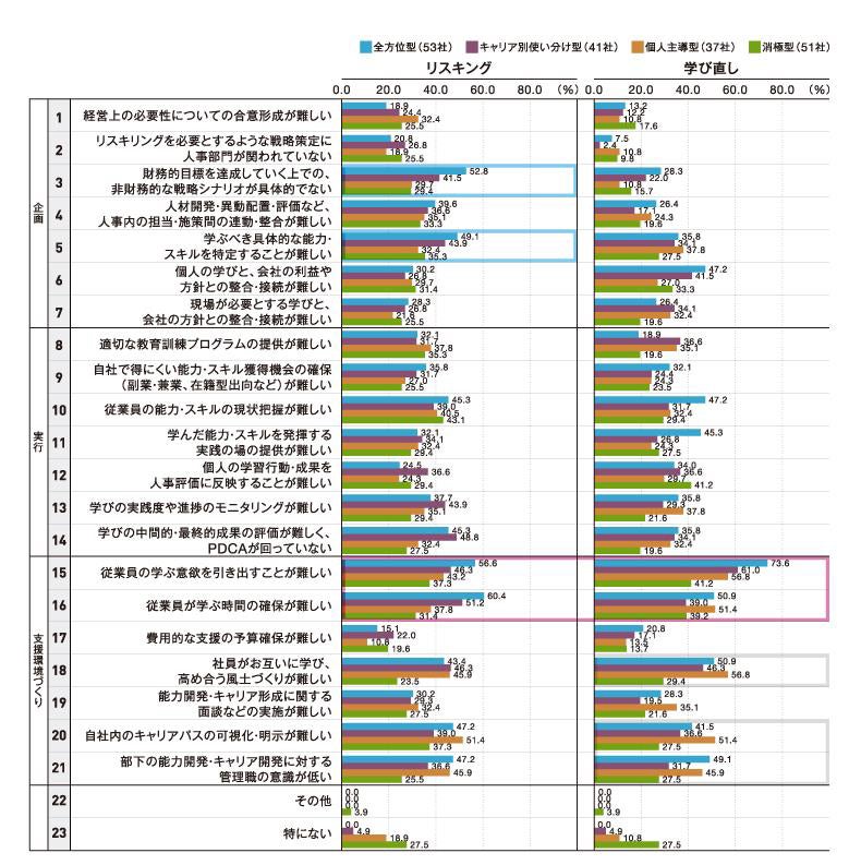 ・<個人主導型>では「学び直し」の推進課題として、「18.社員がお互いに学び、高め合う風土づくりが難しい」「20.自社内のキャリアパスの可視化・明示が難しい」「21.部下の能力開発・キャリア開発に対する管理職の意識が低い」など支援環境づくりの選択率が高い。