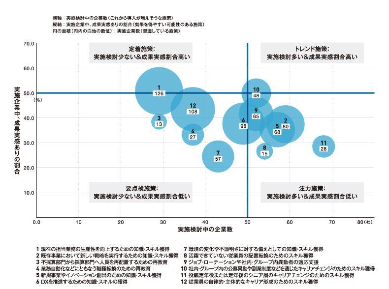 ・右上エリアは、実施企業が増え成果の見通しもある<トレンド施策>といえ、「10.社内・グループ内の公募異動や副業制度などを通じたキャリアチェンジのためのスキル獲得」が該当する。