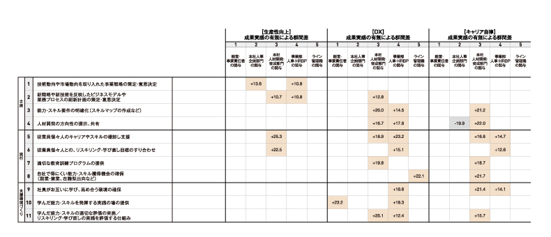 ・【キャリア自律】については、「3.本社人材開発・育成部門」の関与に差が見られ、個人のためと企業のためという学習の文脈の接続が成果実感を分ける可能性がある。