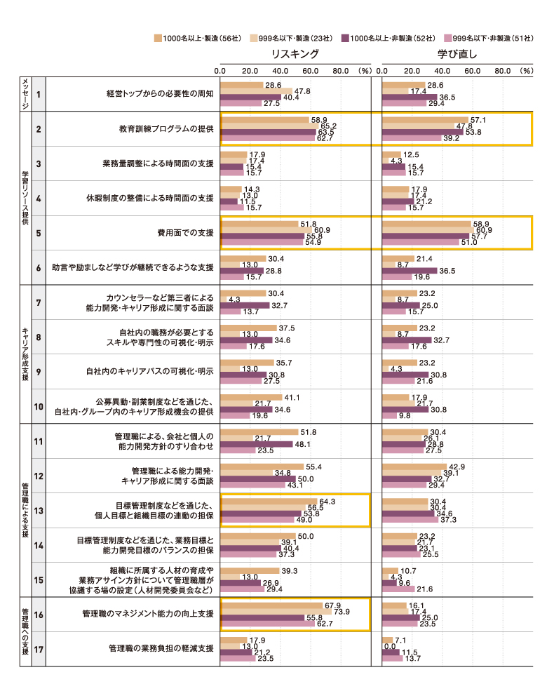 ・導入率の平均が5割以上の「リスキリング」支援策は、導入率が高い順に「16.管理職のマネジメント能力の向上支援」「2.教育訓練プログラムの提供」「13.目標管理制度などを 通じた、個人目標と組織目標の連動の担保」「5.費用面での支援」である。