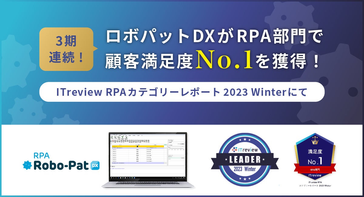 株式会社FCEプロセス&テクノロジー(東京都新宿区、代表取締役社長:永田純一郎)が提供する事務職でも作れる純国産RPA『RPA Robo-Pat DX(以下、RPAロボパットDX)』は、アイティクラウド株式会社(以下:アイティクラウド 本社:東京都港区、代表取締役社長:黒野 源太)が実施するSaaSプロダクト比較・分析レポート「ITreviewカテゴリーレポート」のRPA部門において最も高い満足度を獲得し、3期連続で「顧客満足度No.1」を獲得いたしました。また「ITreview Grid Award 2023 Winter」の同部門においても、6期連続で満足度・認知度ともに優れた製品に贈られる「Leader」を受賞いたしました。