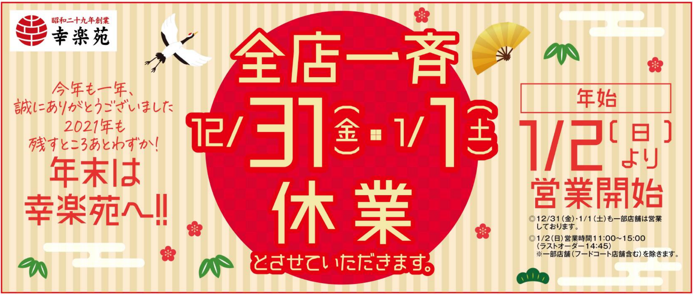 株式会社幸楽苑ホールディングス(本社:福島県郡山市、代表取締役社長:新井田 昇、以下「幸楽苑」)は、働く仲間への感謝の気持ちを込め、「年末年始休業」を今年も実施させて頂きます。今年は昨年よりも休業日を1日増やし、2021年12月31日(金)から2022年1月1日(土)を休業とし、さらに2022年1月2日(日)を11時から15時の時間短縮営業といたします。お客様にはご不便をおかけしますが、何卒ご理解賜りますようお願い申し上げます。