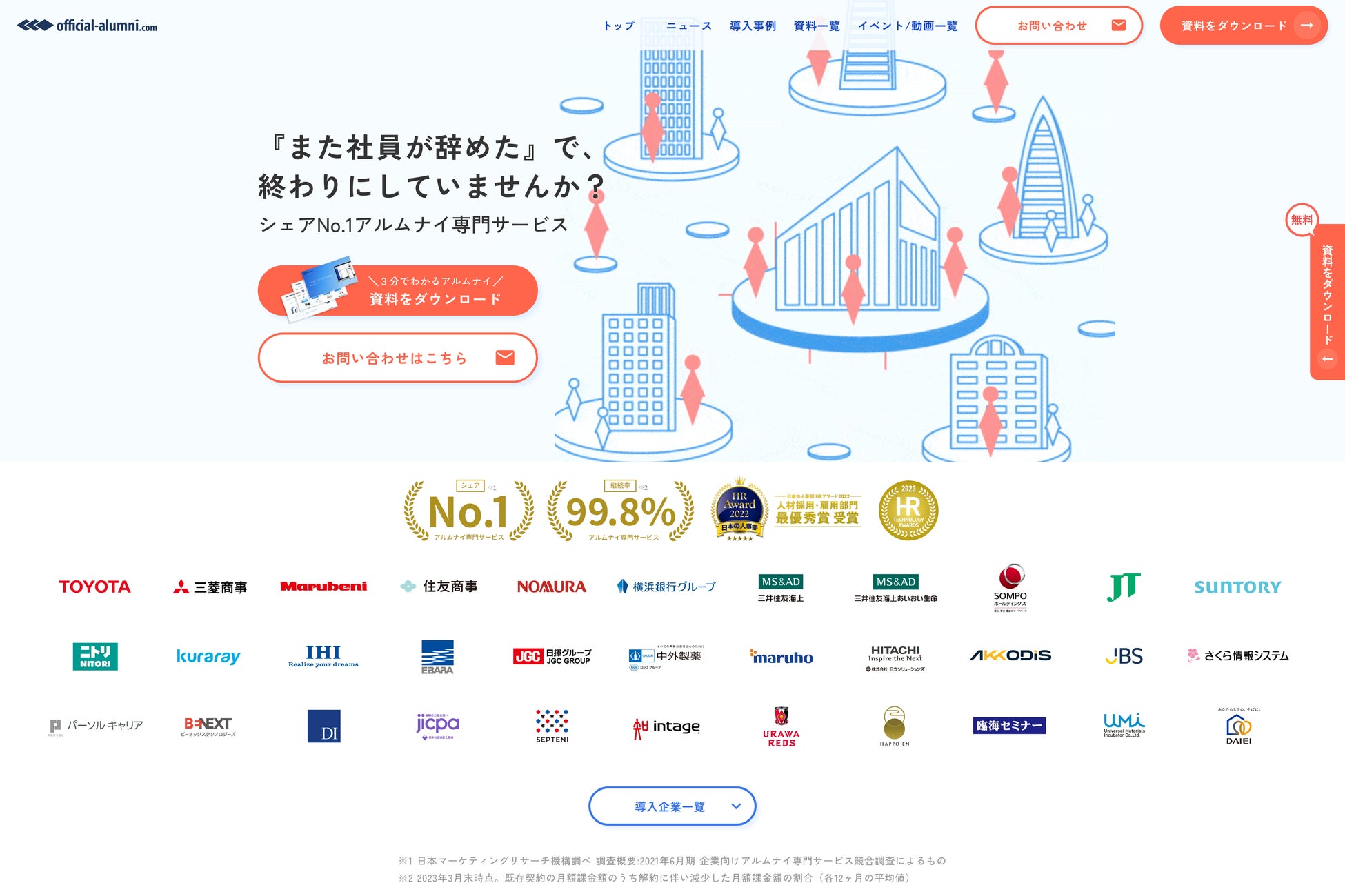 *日本マーケティングリサーチ機構調べ 調査概要:2021年6月期 企業向けアルムナイ専門サービス競合調査によるもの