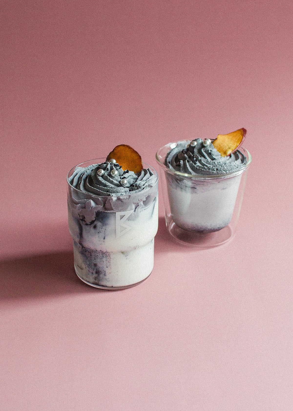 吉田志穂個展「印刷と幽霊」の作品から着想し、インキの滲みや実体のないゴーストを、紫芋を使ったドリンクで表現しました。
