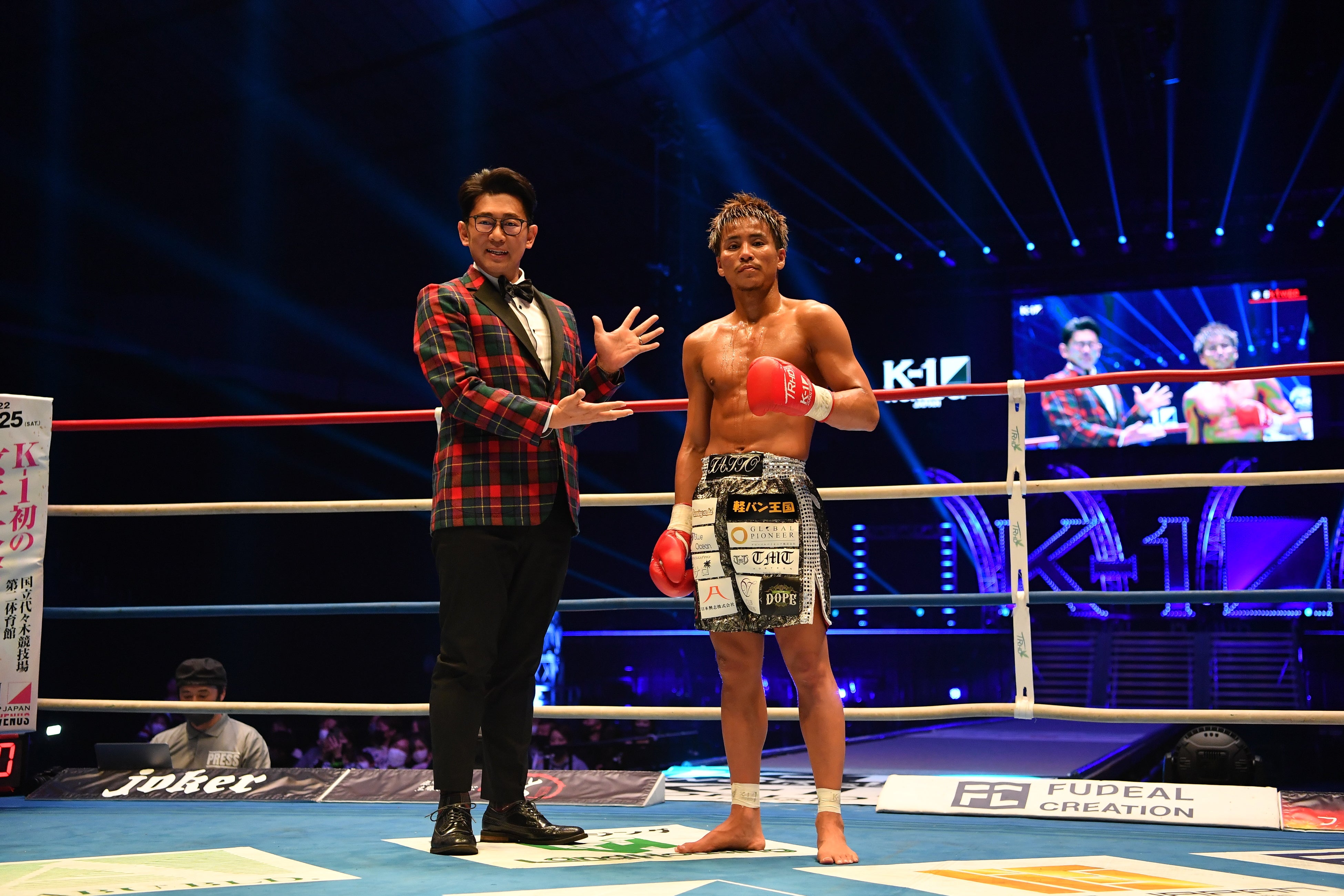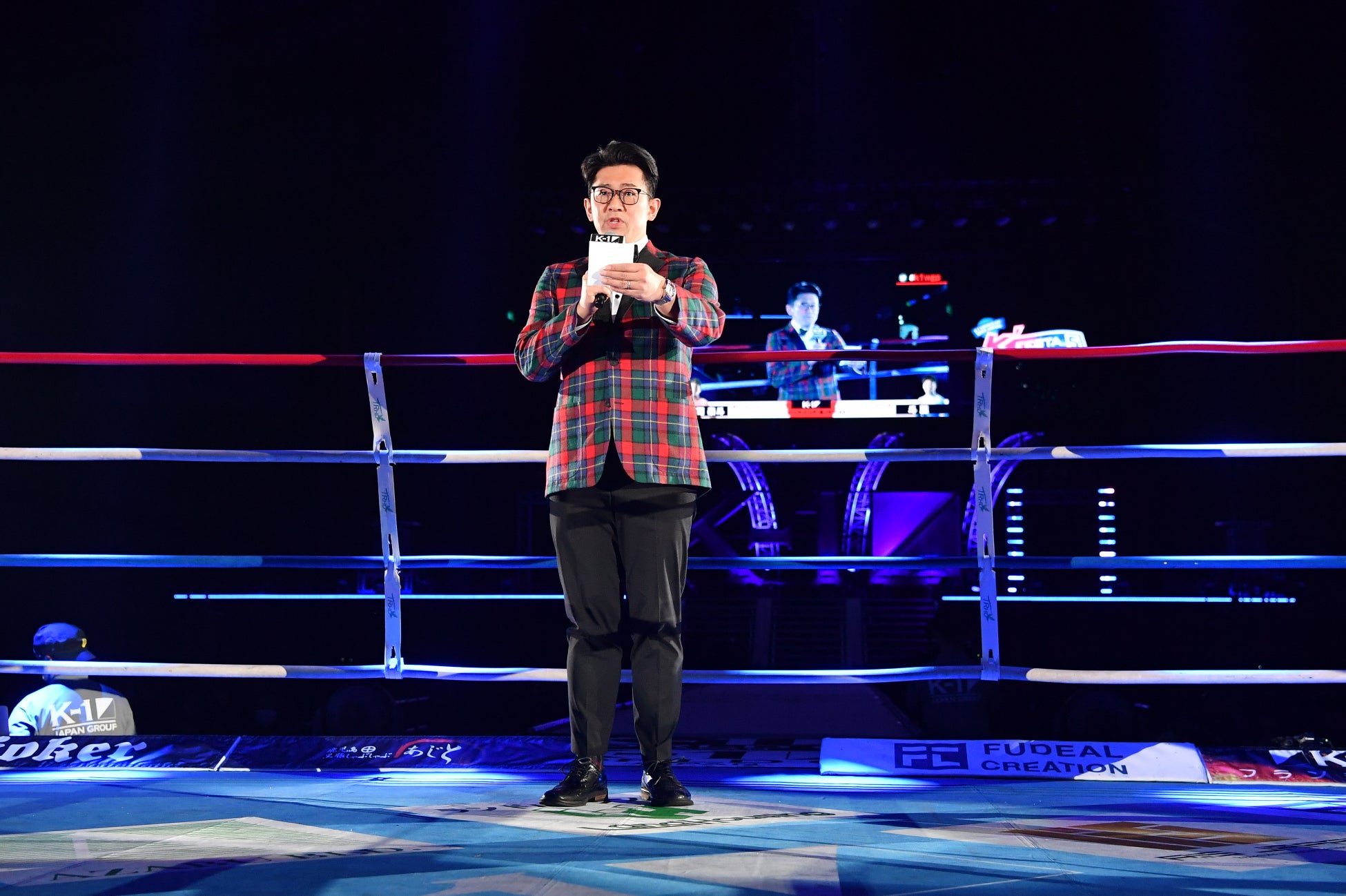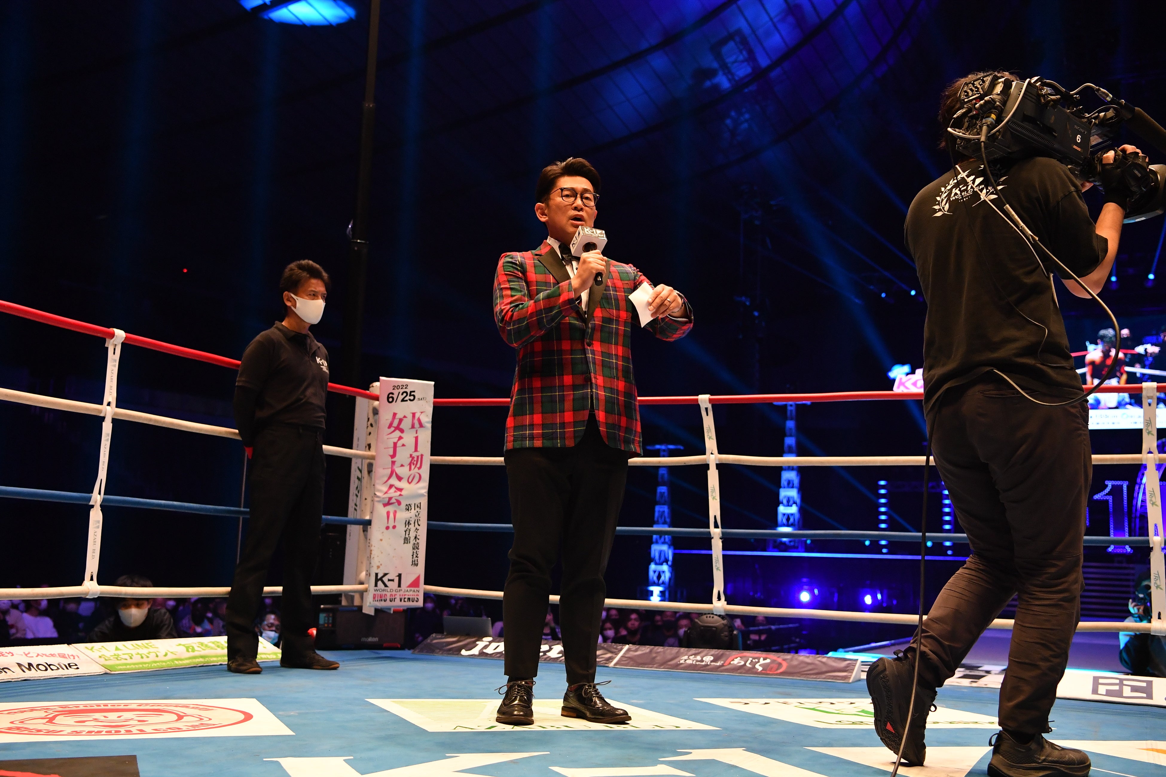 ビビる大木さんには、第14試合[スーパーファイト/K-1フェザー級/3分3R・延長1R]にて先日K-1 3階級王者・武尊とのエキシビジョンマッチでも話題になった軍司 泰斗VS斗麗の一戦(延長1Rの末、軍司選手が3-0判定勝ち)に登場いただきました。スペシャルリングアナに初挑戦した感想を伺うと、「緊張しましたよ!なんだか。しくじったらやばいじゃないですか。大切な試合の前に。そこを緊張していて。」と話し始め、「リングサイドで出番を待っているときに、左に武尊選手、右にピーター・アーツさんがいて。ミーハー心が出てしまって登場前から緊張していました。」とお話しいただきました。