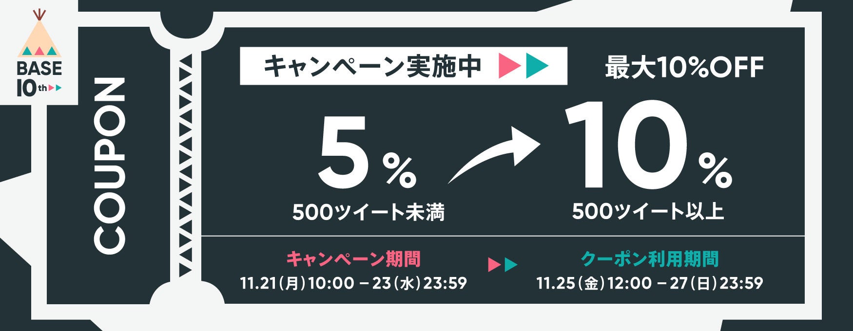 10th Anniversaryクーポンキャンペーンに関する情報は、「BASE」の公式Twitterでも発信いたします。