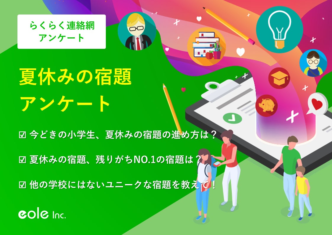 毎年小学生が頭を悩ませる夏休みの宿題。ドリルをはじめ読書感想文、自由研究など、親の手伝いが必要になるご家庭も多いのではないでしょうか。今年もイオレは、登録者数 700 万人(2023年6月 30日時点)を突破し多くの主婦・主夫の皆様や PTA の団体連絡ツールなどにご愛用いただいている「らくらく連絡網」にてアンケート調査を実施しました。