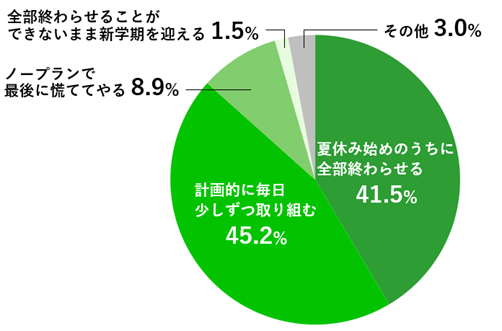 お子さまの夏休みの宿題の進め方についての設問では、「計画的に毎日少しずつ取り組む」が約5割と、2人に1人が計画的に進めているという結果に。「夏休みはじめのうちに全部終わらせる」は41.5%と、前年から3.9%上昇しました。年々宿題を早めに終わらせ、旅行や習い事、自主学習といった宿題以外のことに集中するお子さまが多くなっている傾向が見受けられます。