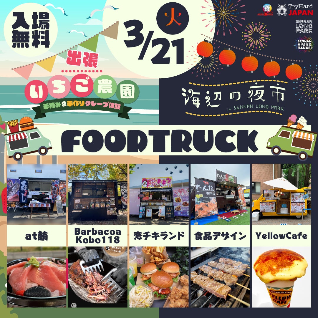 株式会社トライハードジャパン(所在地:大阪市中央区)は、2023年3月21日(火・祝)にSENNAN LONG PARK(センナンロングパーク)(所在地:大阪府泉南市)にて、「泉南海辺の夜市in SENNAN LONG PARK」を開催いたします。