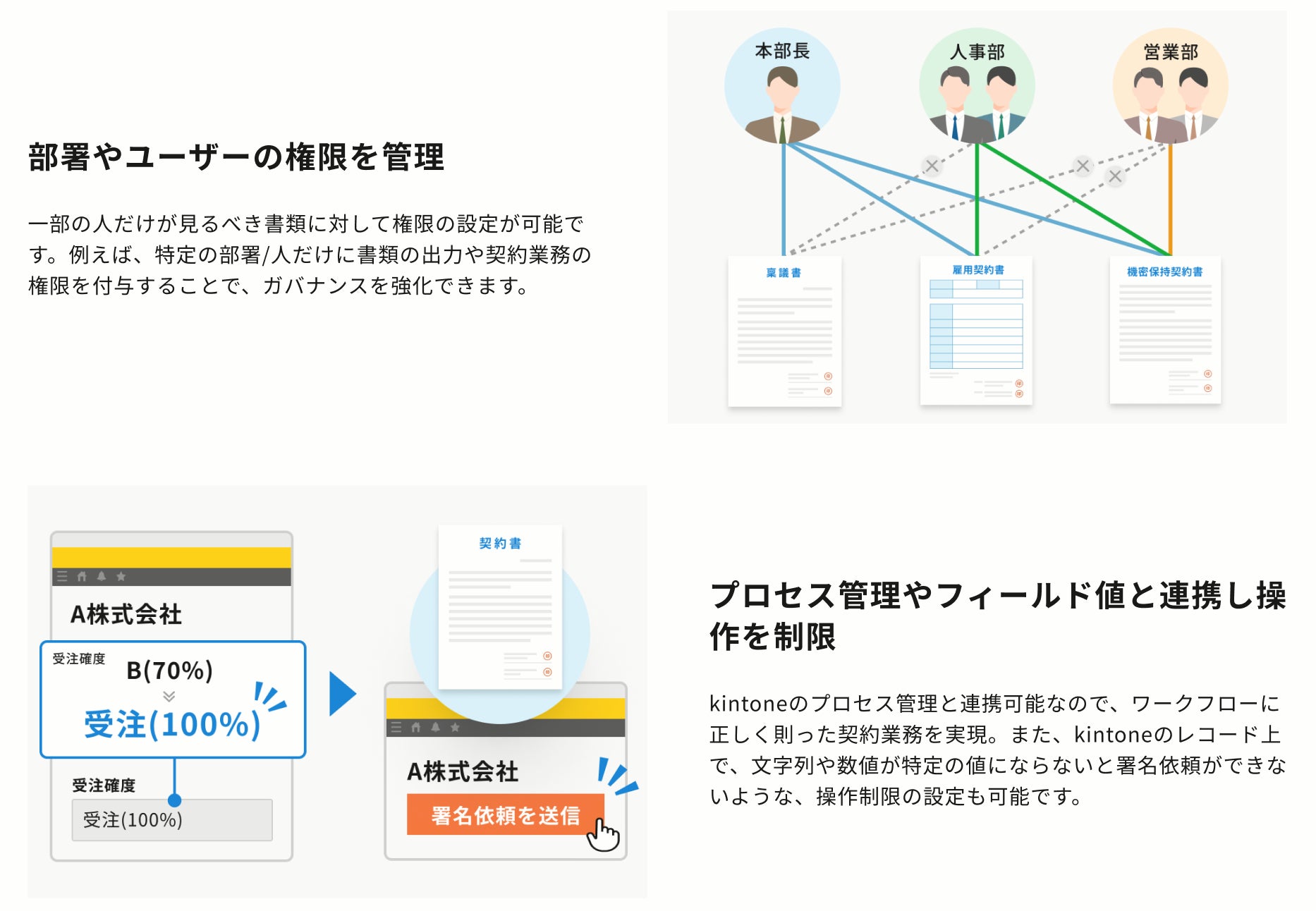 また、部署やユーザーの権限を管理したり、kintoneのプロセス管理やフィールドの値と連携して操作を制限することも可能です。