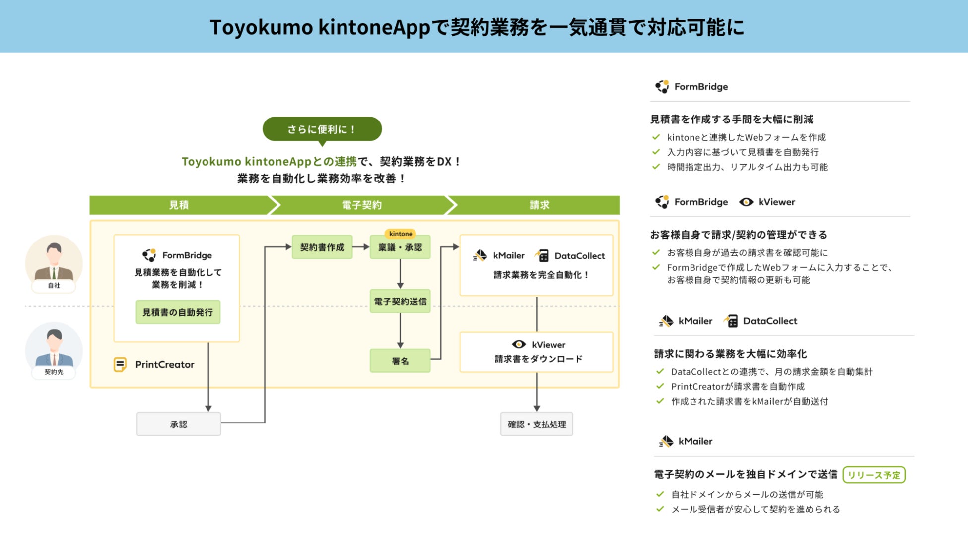 さらに、契約業務で発生する見積や請求業務もToyokumo kintoneAppの他の製品と組み合わせることで、契約前後の業務も丸ごと効率化・自動化することが可能になります。