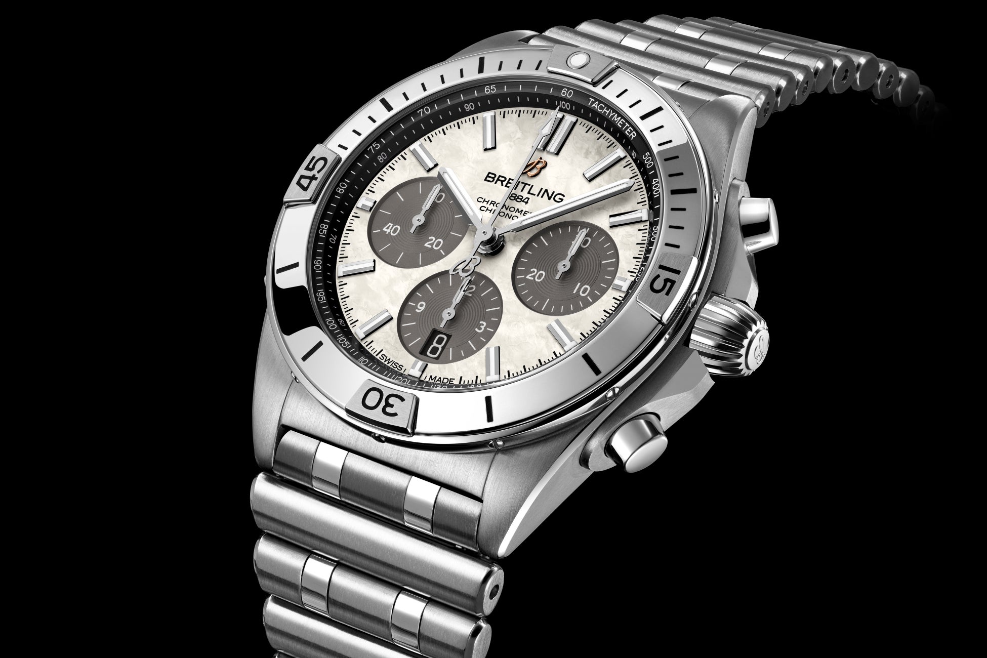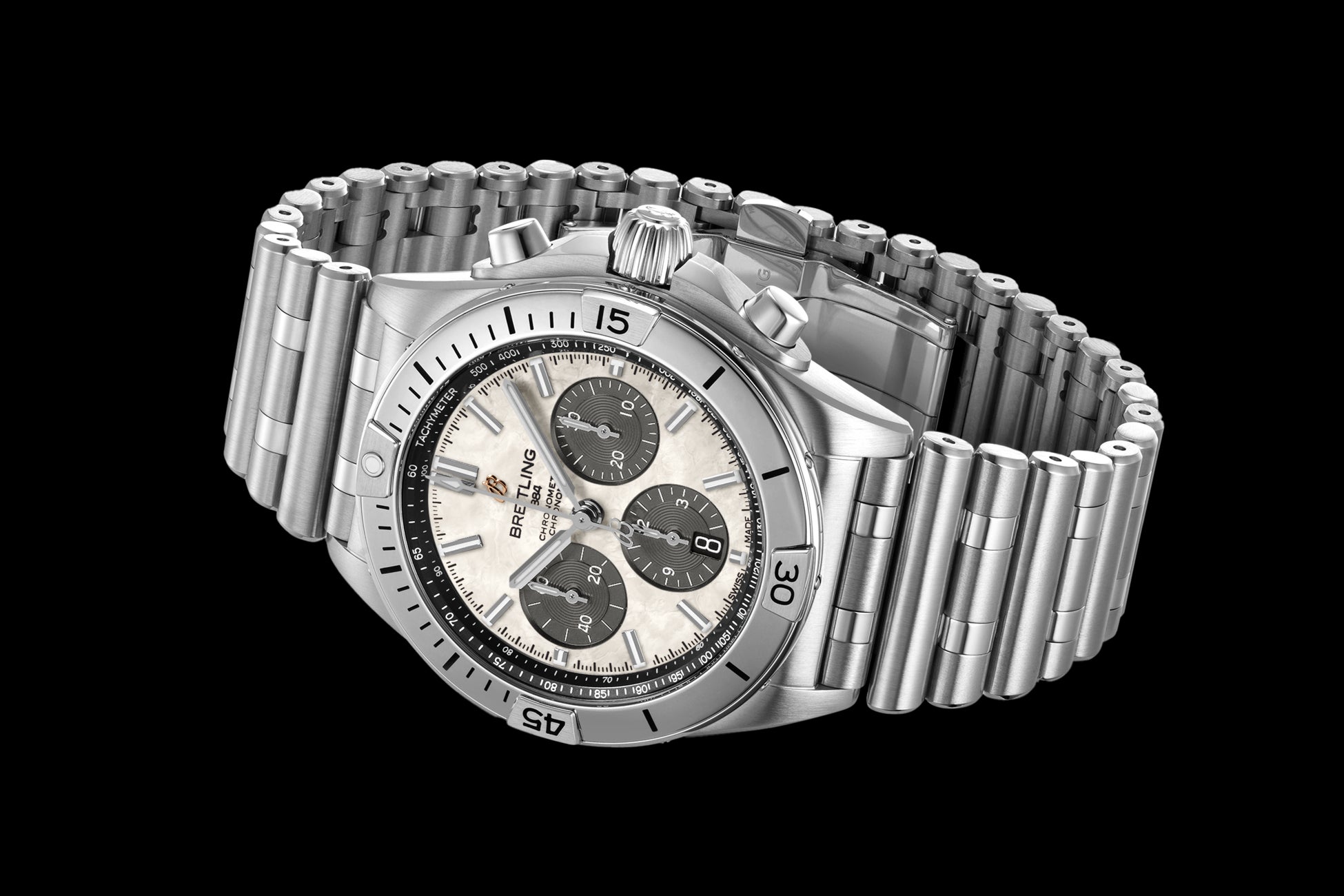 クロノマット B01 42 をベースとした日本限定モデル第三弾には、ホワイト マザー オブ パールを採用。真珠母貝の文字盤は、その唯一無二の美しさから日本では常に高い人気を誇るディテールです。ウィンターシーズンにぴったりの美しく輝くホワイトと、アンスラサイトのサブダイヤルが見事に調和したエレガントなカラーリングに、金色のブライトリングロゴが映えます。機能性を維持しながら美しさまで兼ね備えたタイムピースには、精度と信頼性における最高の認定基準であるCOSC 公認クロノメーター、マニュファクチュールキャリバー01 を搭載。サファイアクリスタルケースバックからその美しいムーブメントを覗き込むことができます。