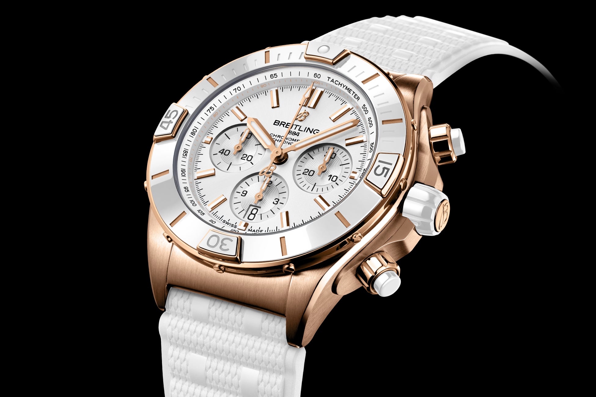 より大胆でスポーティーなスーパー クロノマットは、コレクション初となるセラミックがインサートされたステンレススチール製ベゼルを装備。加えてクロノグラフのプッシュボタンやリューズにも同様にセラミック インサートを使用しています。アイコニックなルーローブレスレットにインスパイアされたラバーストラップも特徴的です。本作は44㎜のケースに18Kレッドゴールドを採用。繊細なつや消し加工のなかにポリッシュ仕上げが際立つ、抑制のきいた華やかさが特徴です。文字盤上の針、インデックスそしてロゴのBまでも同系色で統一し、目盛りの黒がブライトリングらしく文字盤を凛々しく引き締めています。ケースバックからみられるマニュファクチュールキャリバー01 のローターもゴールドをあしらった特別仕様。金の不朽の魅力と、セラミックの耐摩耗性が出会った本作は、金継ぎされた白磁のように、特別なものを軽やかに使いこなす方に相応しいモデルです。本作は25本のみの限定販売です。