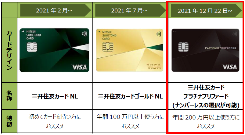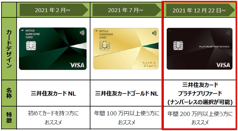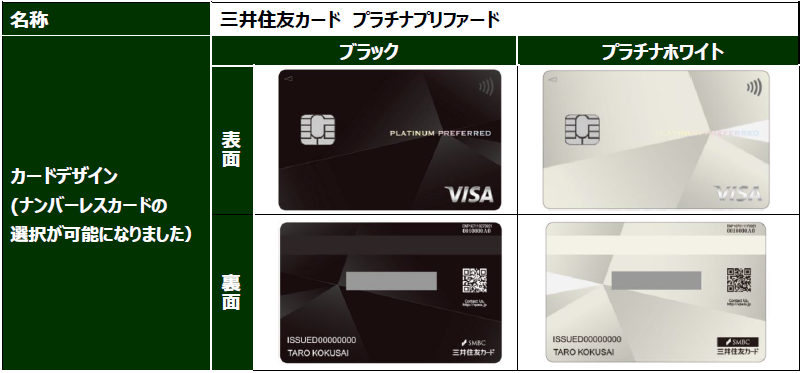 「三井住友カード プラチナプリファード」は、プラチナカードのステータスと、圧倒的なポイント還元を実現した、 全く新しいプラチナカードとして、2020年9月1日より発行を開始し、これまでに大変多くのお客さまにご利用いただいております。今回の“ナンバーレスカード”の追加により、「三井住友カード プラチナプリファード」が備える高級感と利得性に加えて、より安心と安全性が強化されたプラチナカードのご提供が可能となりました。