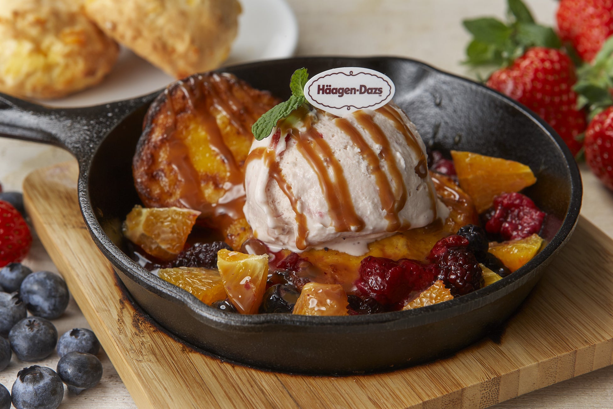 アメリカのレッドロブスターのシグニチャーメニュー「チーズビスケット」をフレンチトースト仕立てにしてそちらにハーゲンダッツ ストロベリーをオン。3種のベリーとオレンジをトッピングしました。レッドロブスターならではのオリジナルな1品です。