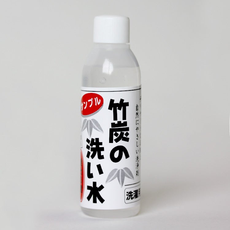 竹炭・竹炭灰・水のみで作られた100%天然成分の洗濯洗剤「竹炭の洗い水」ミニボトル(約25ミリリットル)を、先着300名様に無料でプレゼント!すすぎ1回でOK、柔軟剤不要で省水・省エネにも役立ちます。