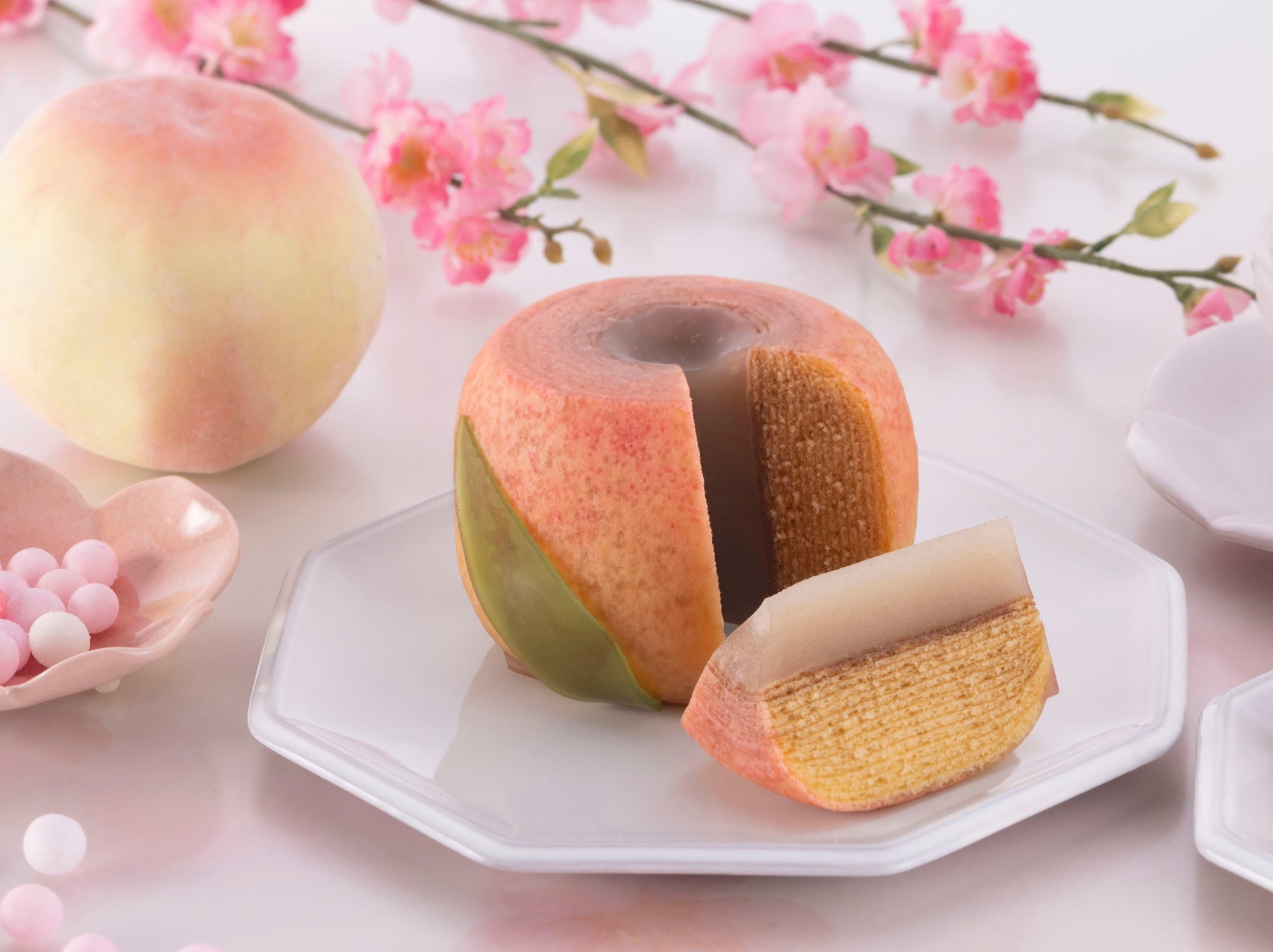 桃そっくりな桃の形のバームクーヘン。 桃のフルーティさを表現するために「桃のフルーツ羊羹」を流し入れました。 「桃のフルーツ羊羹」は新鮮な完熟白桃のピューレを生かした羊羹です。 バームと共にお召し上がりいただくことで、フルーティな完熟白桃の味をお楽しみいただけます。