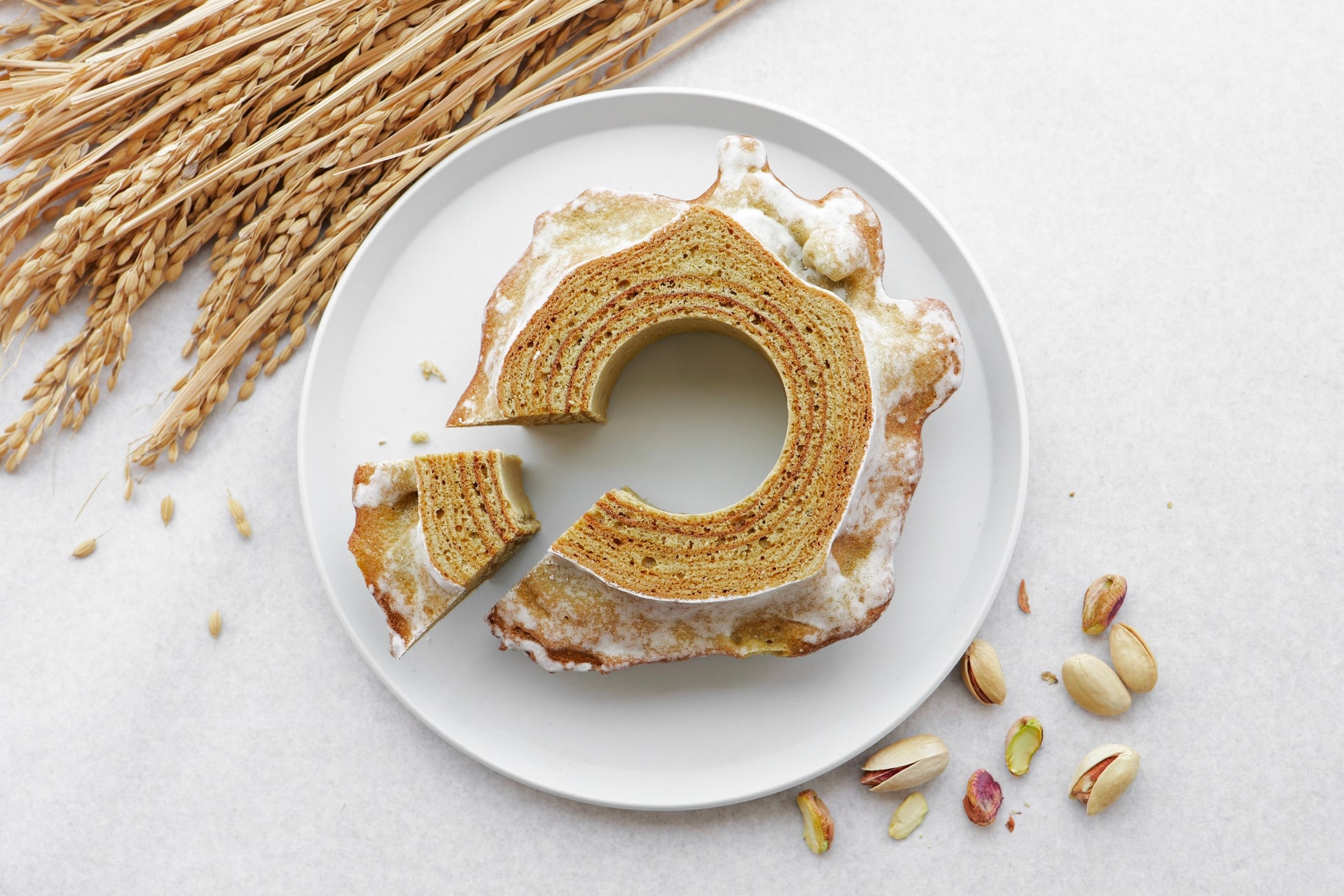緑の宝石エメラルドや、ナッツの女王と呼ばれるピスタチオをふんだんに使用した贅沢なバームクーヘンです。