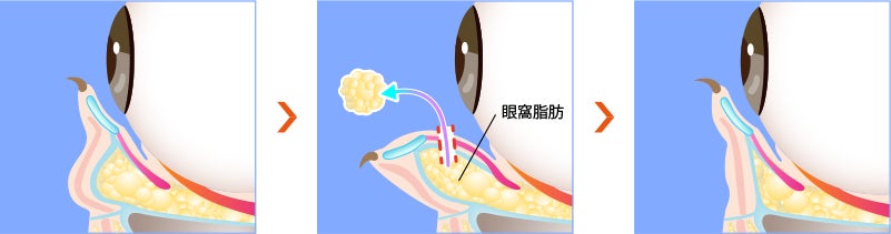 目の下のクマ・たるみの大きな要因である「眼窩脂肪」を取り出して適切な量に留めることで、下まぶたのふくらみをなくしてクマ(ふくらみの影)やたるみを改善します。脂肪はまぶたの裏側をほんの僅かに切開して取り除くため、傷跡は外からは分からずダウンタイムも短いことも特徴です。