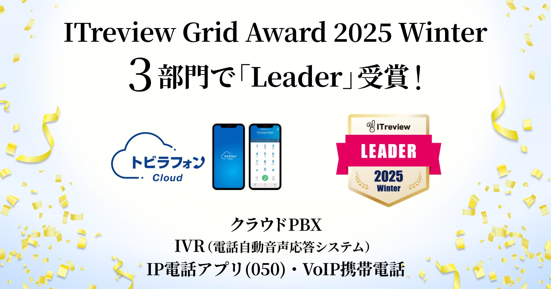 「トビラフォン Cloud」が、ITreview Grid Award 2025 WinterのクラウドPBX・IVR・IP電話アプリの3部門で「Leader」を12期連続受賞