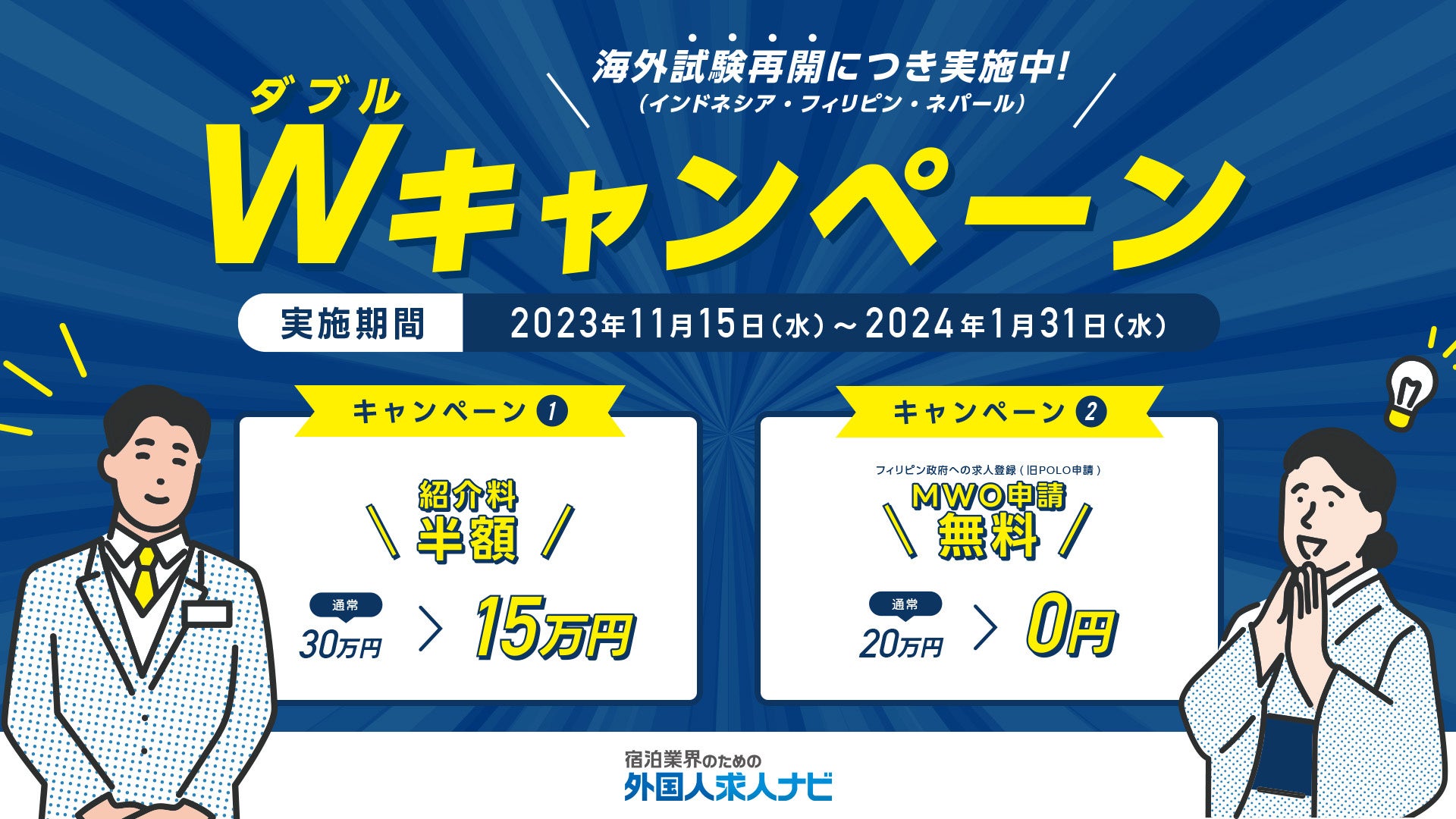 コロナ禍を経て2023年11月より、インドネシア、フィリピン、ネパールの各国で宿泊分野における「特定技能1号測定試験」の開催日が決定したことで、今後は合格者の増加が見込まれています。これに伴いダイブは、「外国人人材の採用実績がない」「具体的な行動に移せていない」などでお悩みの宿泊施設を対象に、特定技能で雇用された場合の紹介料を期間限定の「半額キャンペーン」と、フィリピン人労働者を受け入れる際に必要な「MWO申請(*注)の手続きを無料」で行うキャンペーンを実施することにいたしました。
