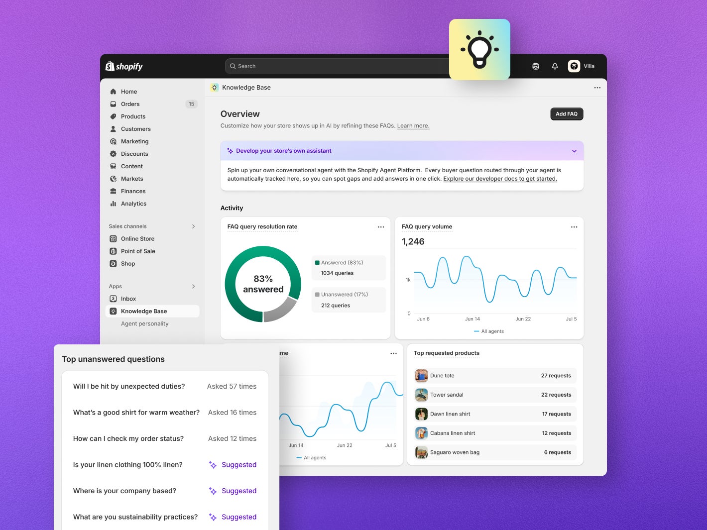 AIとの対話が重要な購買チャネルになりつつある今、ブランド情報が適切にAIに伝わらないと、ビジネスチャンスを逃してしまいます。AIのためのSEとして機能するShopifyの新しいAI搭載アプリKnowledge Baseは、生成AIやショッピングアシスタントが正しく読み取れるように、ストアに関する情報やよくある質問(FAQ)を生成・カスタマイズし、AIによる見つけてもらいやすさを向上させることができます。