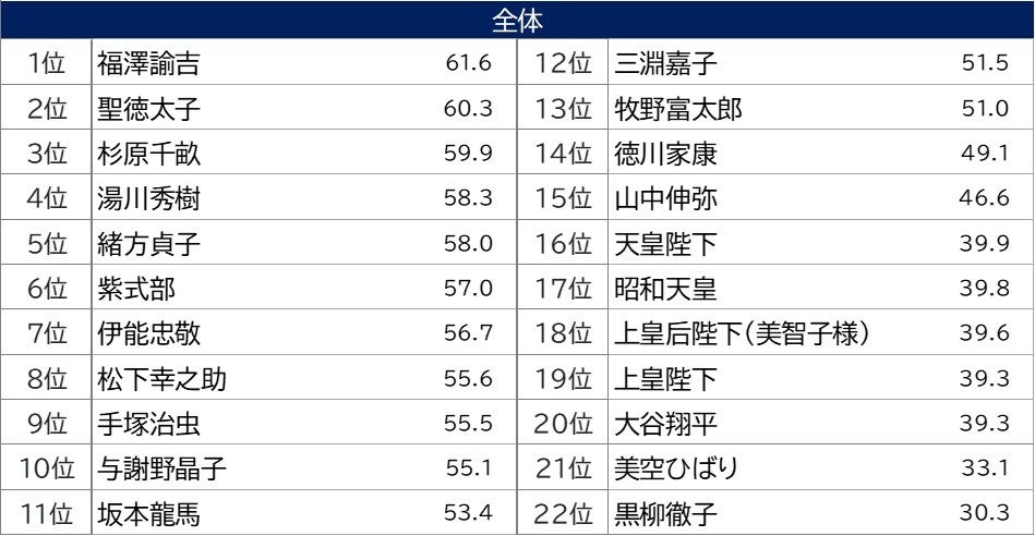 各人物の評価(7段階)に応じて配点し、ランキングを算出した。