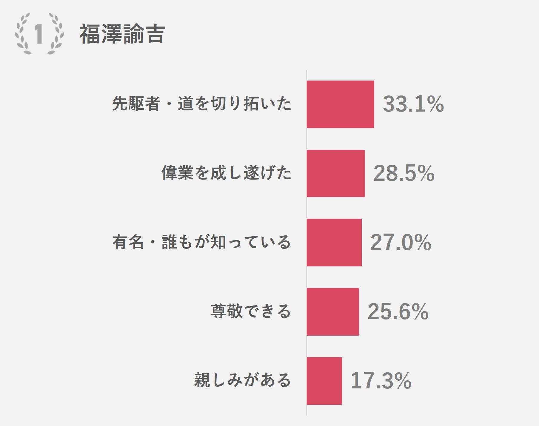 理由1位は「先駆者・道を切り拓いた」。3位は「有名・誰もが知っている」、5位には「親しみがある」が入った。1984年に1万円の肖像に起用されてから約40年と長く、慣れや継続を望む声が挙がった。