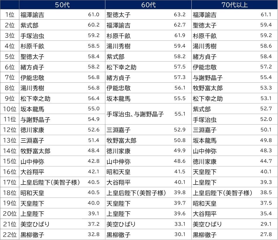 50代以上の女性が選ぶ「お札の肖像になってほしい人物(※以下、敬称略)」は、1位福澤諭吉、2位聖徳太子でした。偉業に畏敬の念を示す他、「慣れ親しんでいる」「(小さい頃から)刷り込まれている」という自由記述も目立ちます。1万円札から威厳・重み・ありがたみを感じてきたり、長くにわたり朋友のような関係を築いてきたり、昭和・平成時代のお札の歴史を垣間見ることができました。3位以下を見てみましょう。「杉原千畝」「湯川秀樹」「緒方貞子」「紫式部」など世界レベルで認知&活躍された方が選ばれました。「手塚治虫」「山中伸弥」「大谷翔平」も20位内に入りました。ランク外ですが、「世界に誇れる」という理由で「葛飾北斎」「宮崎駿」「坂本龍一」「小澤征爾」「中村哲」も挙がっています。令和時代の紙幣に相応しいのは、グローバルで通用する日本人ということなのでしょう。