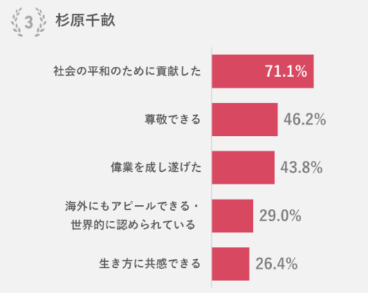 理由1位は「社会の平和のために貢献した」。4位には「海外にもアピールできる・世界的に認められている」が入った。第二次世界大戦中のユダヤ人へのビザ発給に関し、国際的に誇れる日本人として上位に入った。