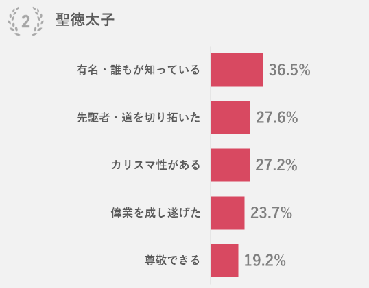 理由1位は「有名・誰もが知っている」。3位には「カリスマ性がある」が入った。60代で1位、70代で2位だった。これまで最も多く紙幣の肖像に採用されており、1958年から1986年まで1万円札の肖像であったため、「お札と言えば聖徳太子」という声も見られた。