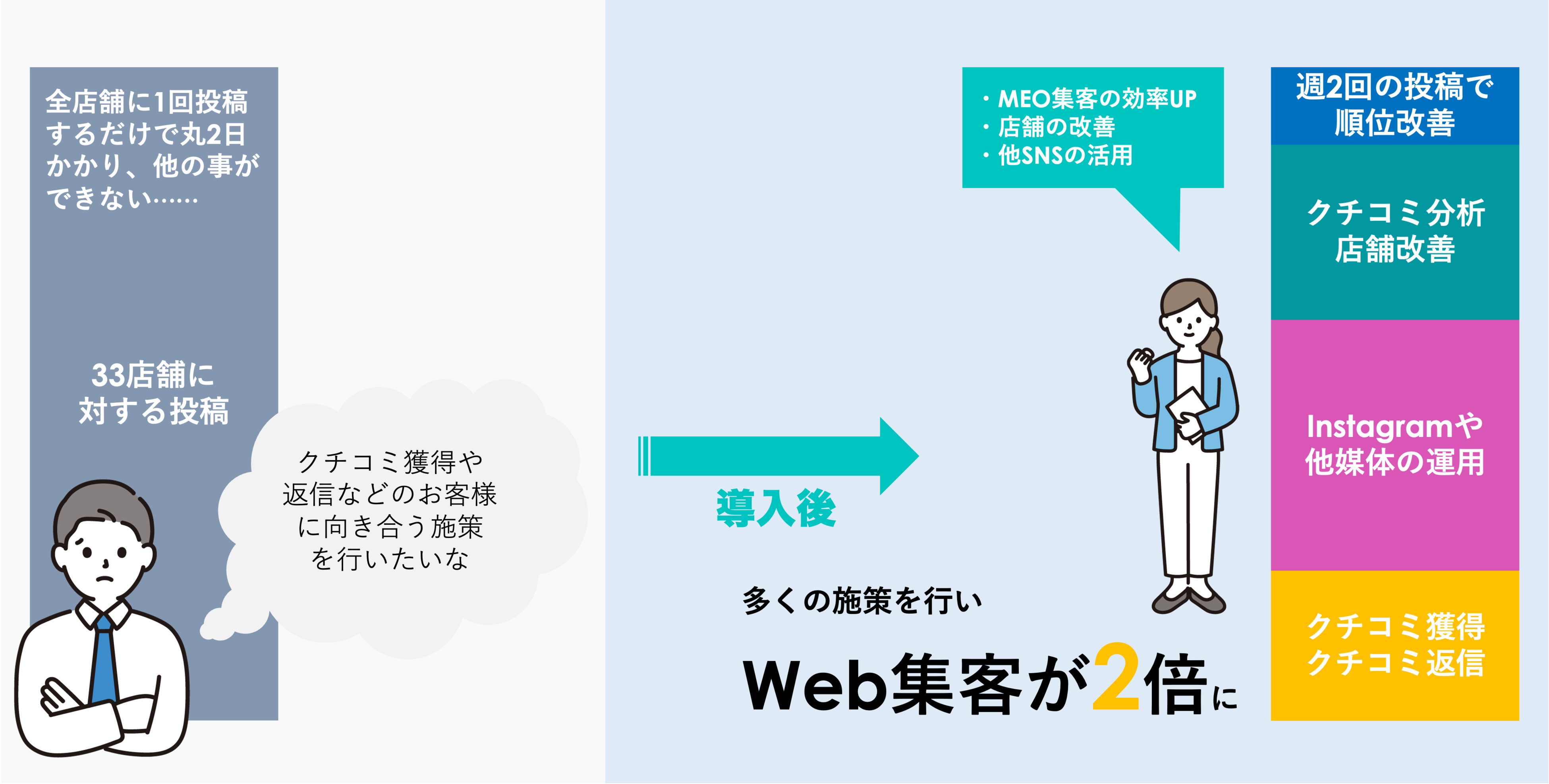 【MEOチェキ導入事例】半日かかっていたGBP運用を30分に削減!削減した時間でクチコミ管理や投稿に時間を充てWebサイト経由のお問い合わせが2倍に増加!
