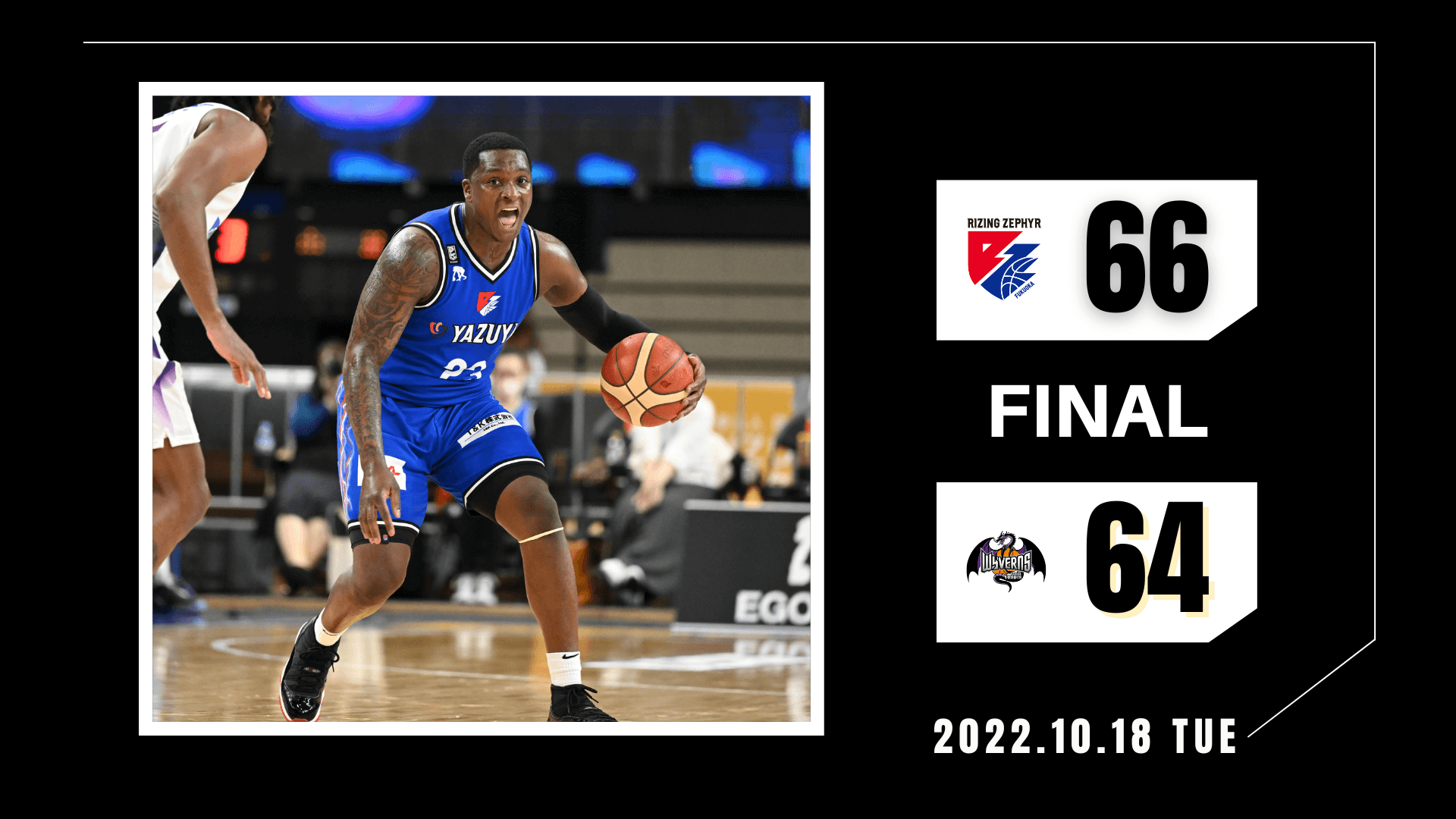 2022年10月18日(火)に開催されましたBリーグ第3節【ライジングゼファーフクオカvs.山形ワイヴァンズ】において“福岡66-64山形”の結果となりましたことお知らせいたします。