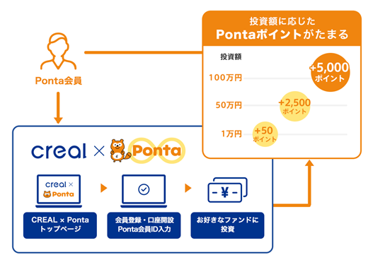 ・ご利用方法:Ponta会員専用ページ(https://creal.jp/ponta)から新規会員登録後、口座を開設し、Ponta会員IDを入力して、投資いただく
