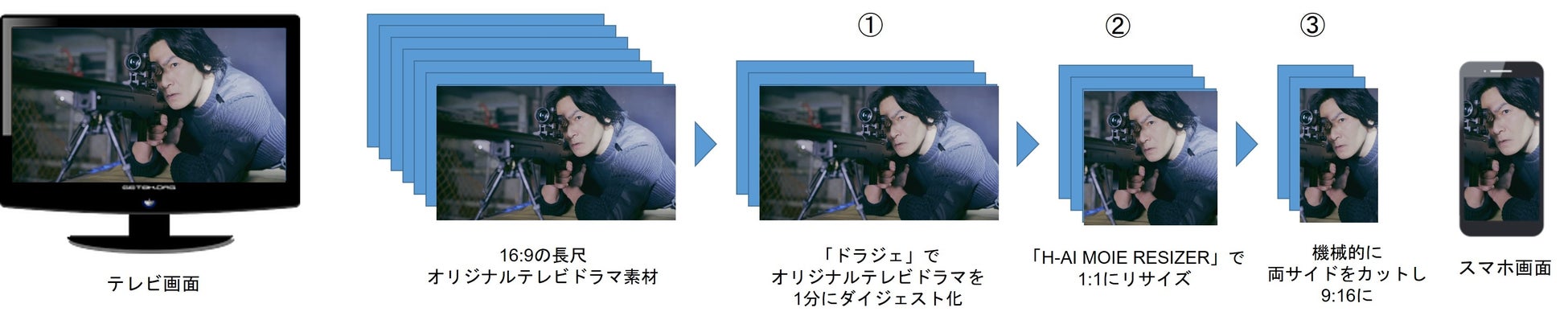 若者(Z世代)に人気の各種SNSや動画プラットフォームでは、スマートフォンを縦にしたままで動画を視聴するUIが主流になりつつあります。テレビドラマのプロモーションをスマートフォンで実施する場合、①長尺のドラマを短尺のプロモーション動画に編集、②テレビ(受像機)画面16:9の横長サイズを、スマートフォンを縦にしたときの画面9:16の縦型サイズに編集、と2段階の編集が必要となりますが、この編集作業には、大変な労力と時間が掛かってしまうという大きな課題がありました。