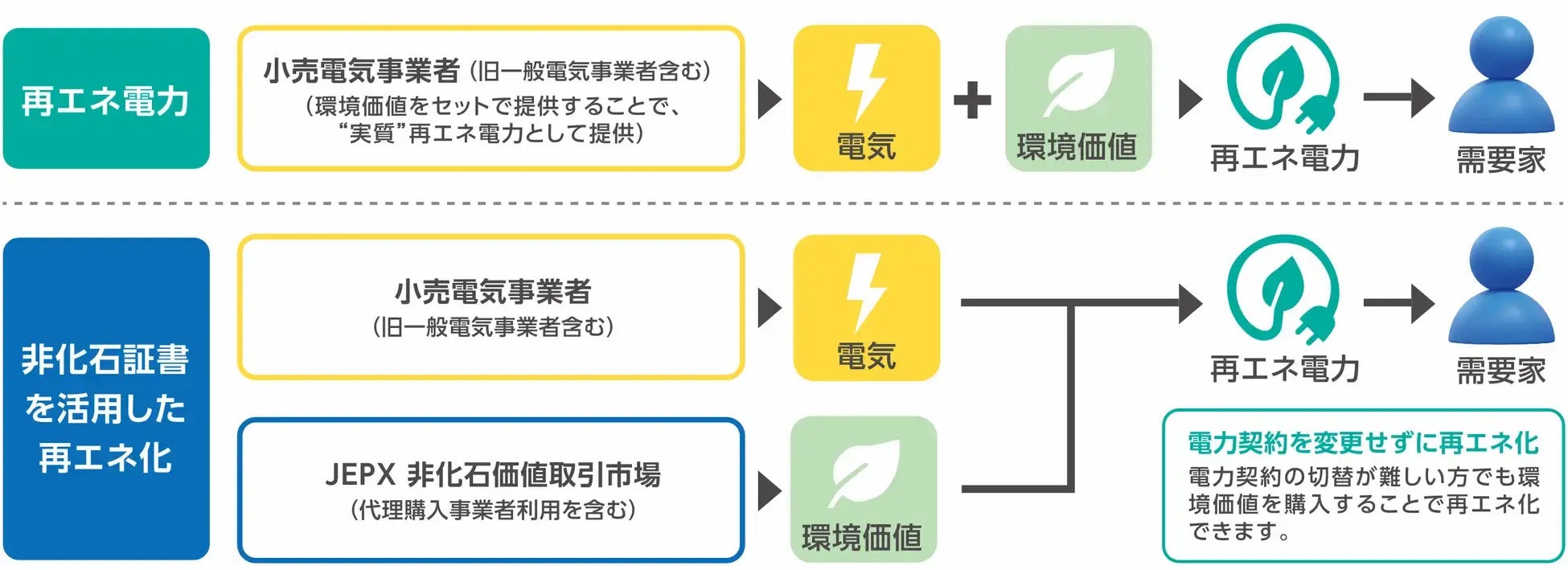 ➀契約変更不要で再エネ化:電力会社の契約変更なしに環境価値を付与できます。