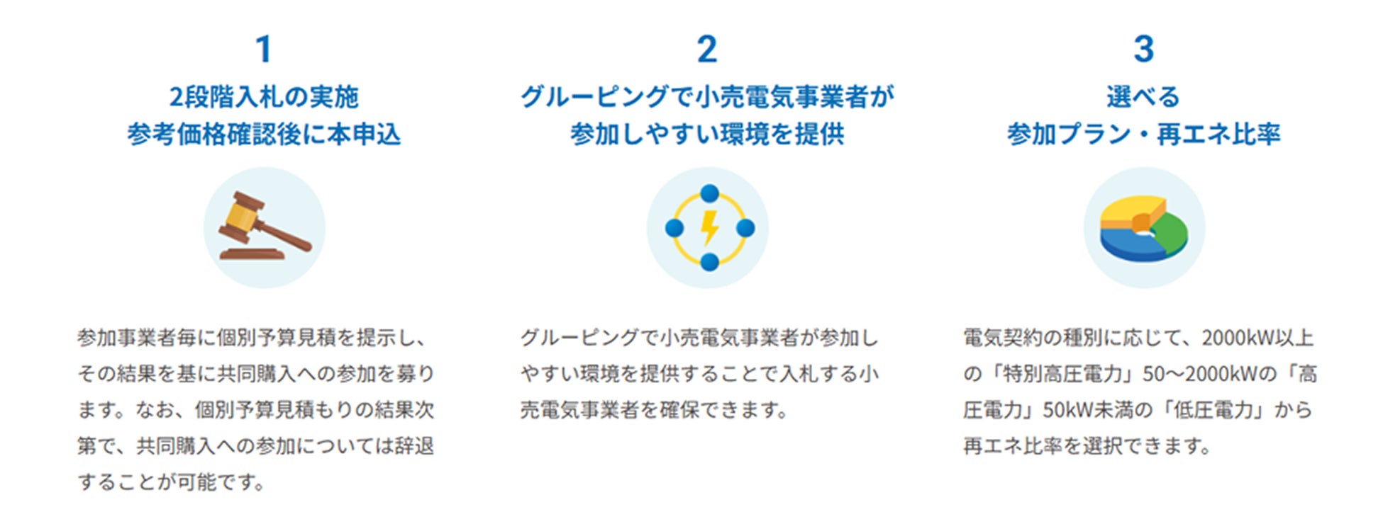 また、他地域の共同調達オークションと歩調を合わせて同時期に再エネ電力共同オークションを開催することでボリュームディスカウントの最大化を図ります。