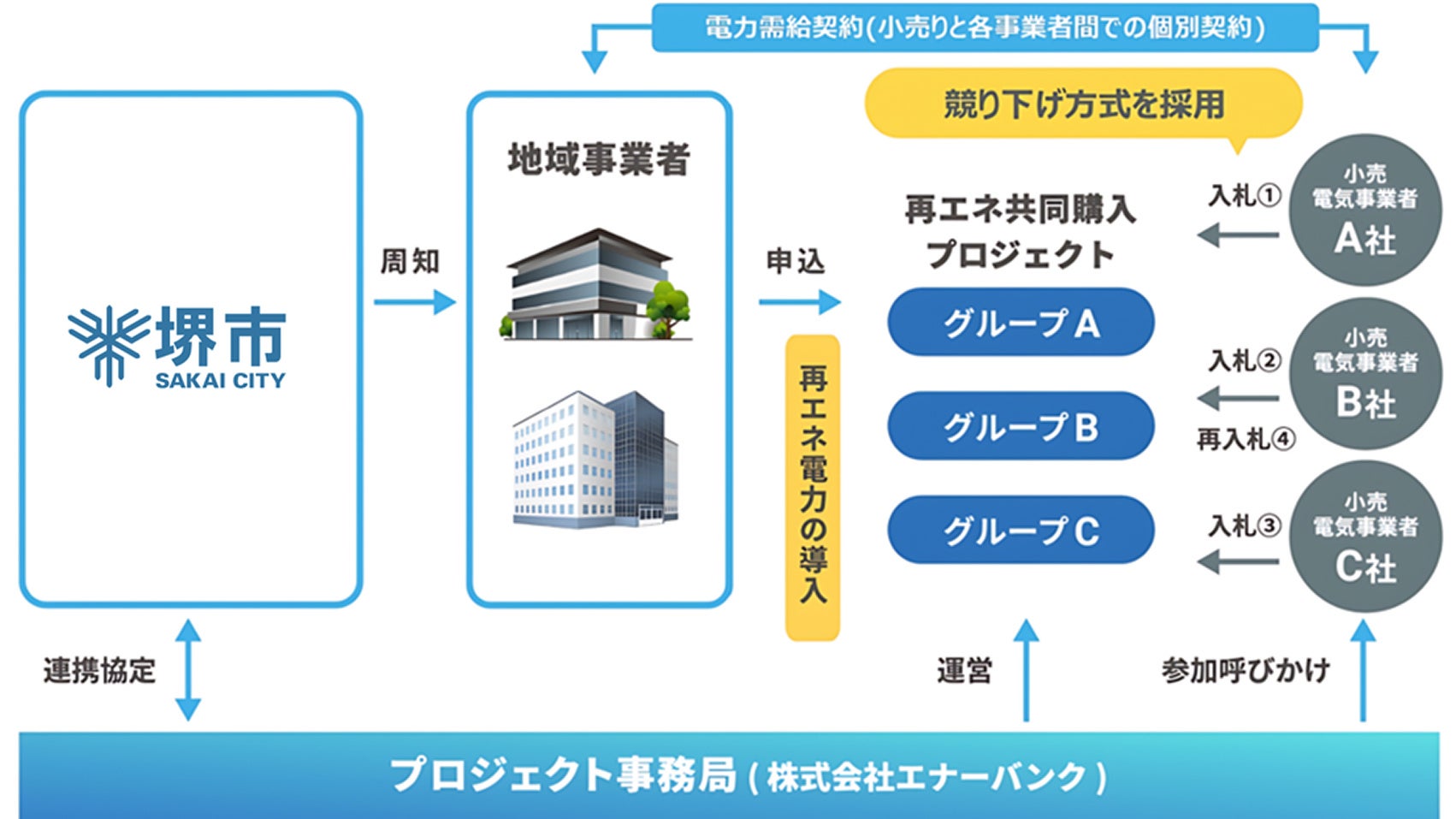複数の事業者が共同で電力を購入することでスケールメリットが生まれ、個別購入に比べて安価に再生可能エネルギーを導入することができる仕組みです。堺市と連携し、地域の脱炭素化及び2050年の脱炭素社会の実現を目指します。