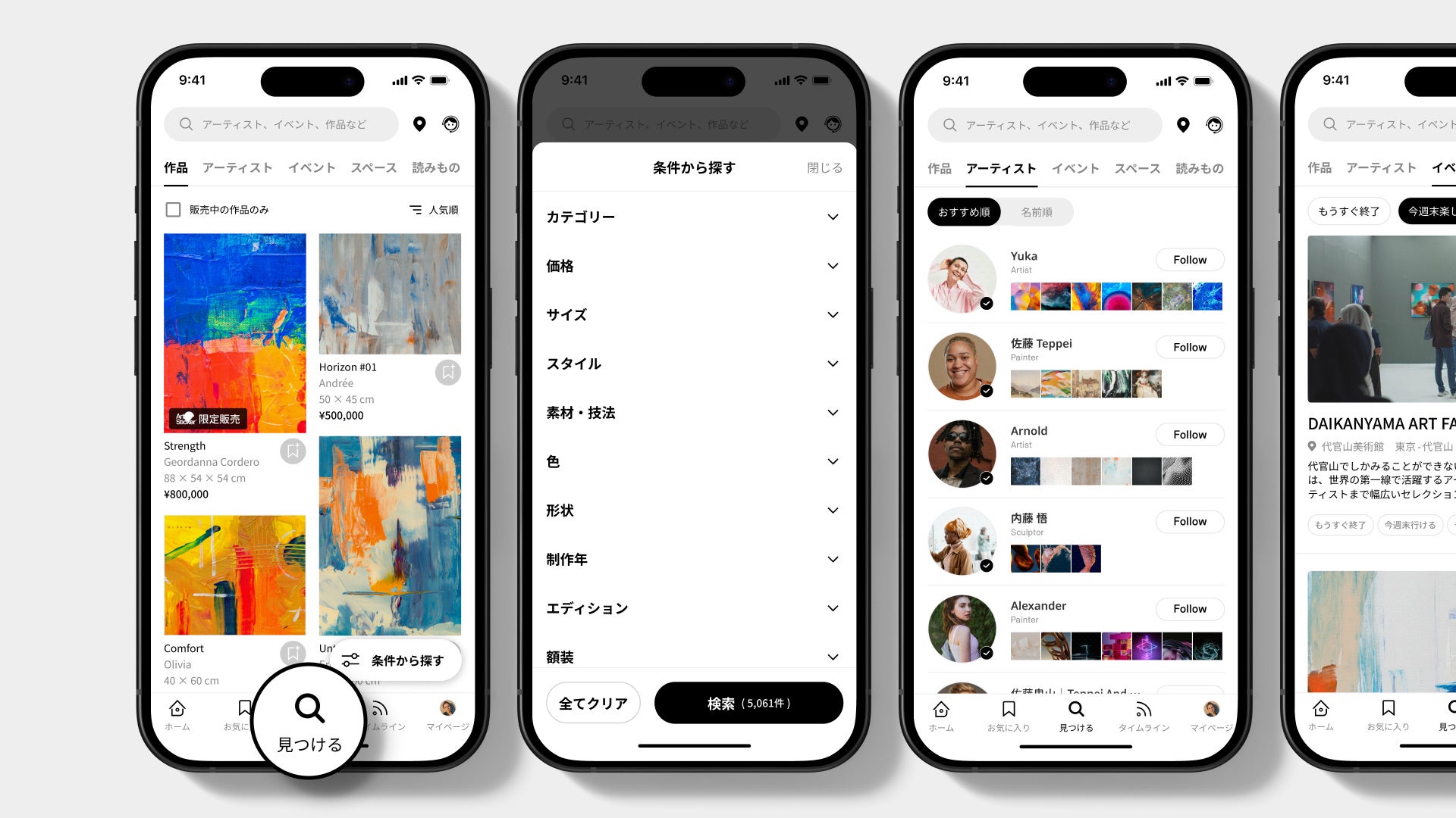 価格、サイズ、カテゴリーなどの絞り込みに加えて、スタイル、素材や技法、色、形状、展示方法での絞り込み機能が追加され、よりお客様のお好みや条件にフィットした作品を探しやすくなりました。