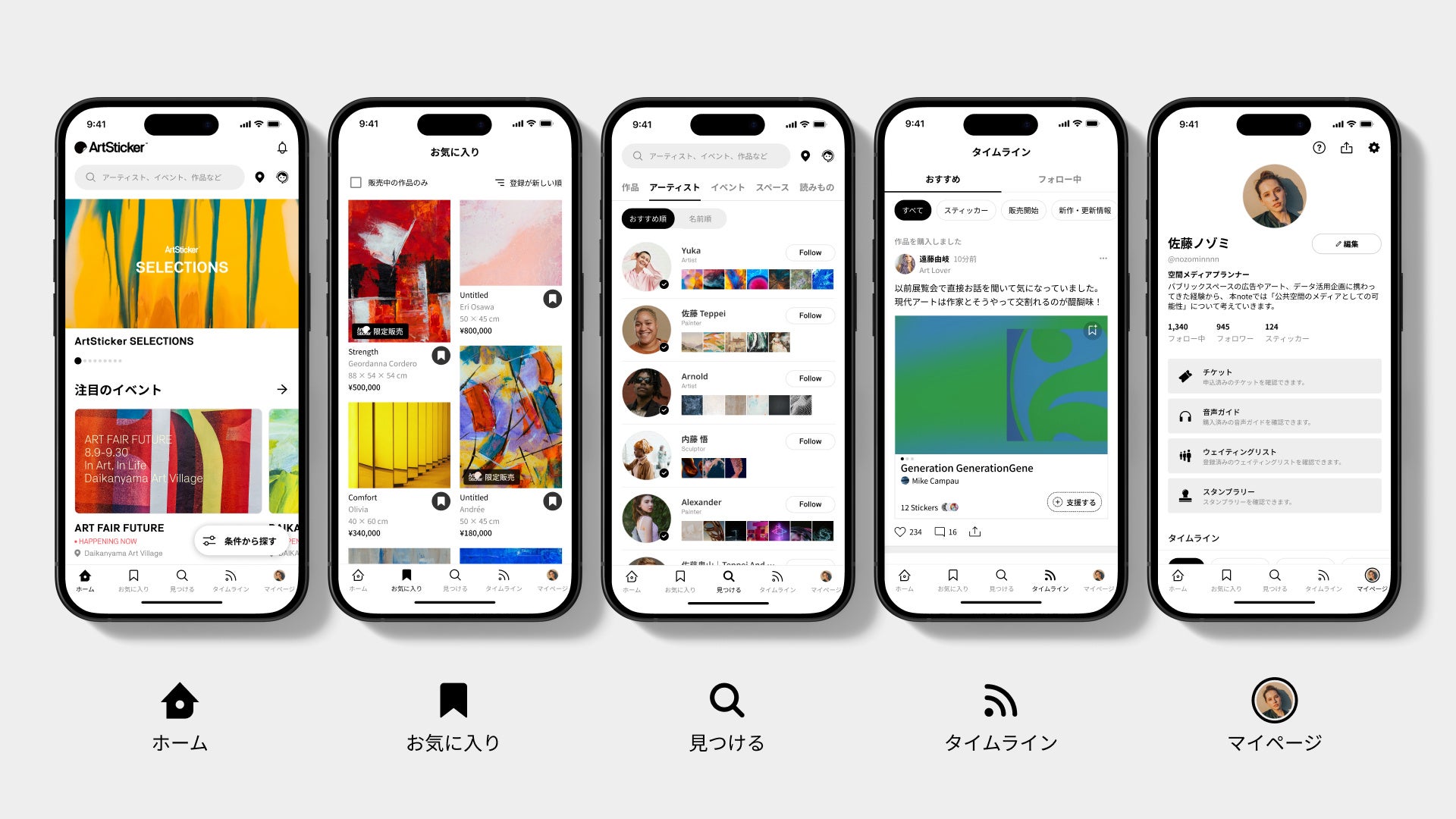 これまでのタイムラインに代わって、作品・アーティスト・イベントなどArtStickerの今注目のコンテンツを表示。パーソナライズ化したおすすめのアート作品、フォロー中アーティストの作品、キュレーターによるセレクションなど、あなたにぴったりのコンテンツをより見つけやすくなりました。