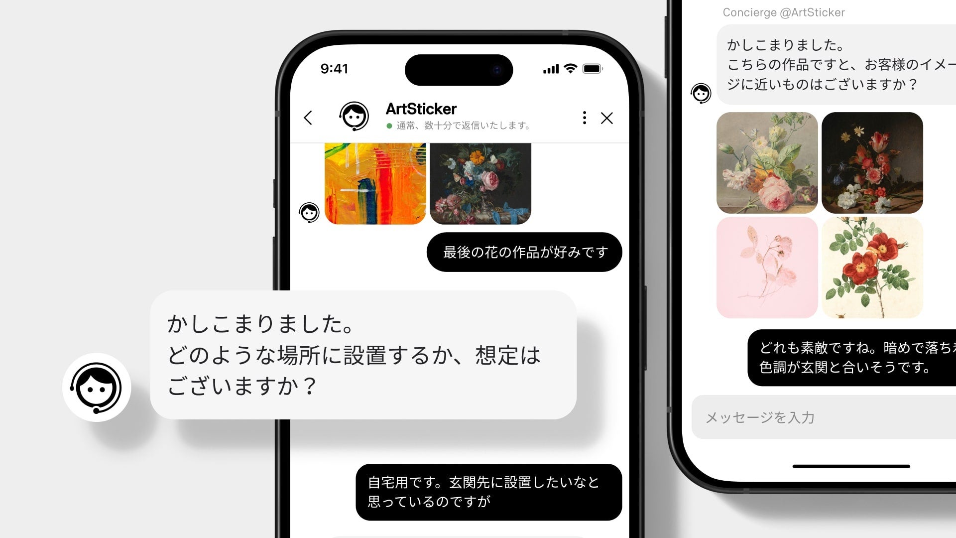 チャットであなたと作品との出会いをお手伝いします。作品を探すのを手伝ってほしい、大切な誰かに贈りたい、どうしてもこのアーティストの作品がほしい…あらゆるシーンでご利用ください。