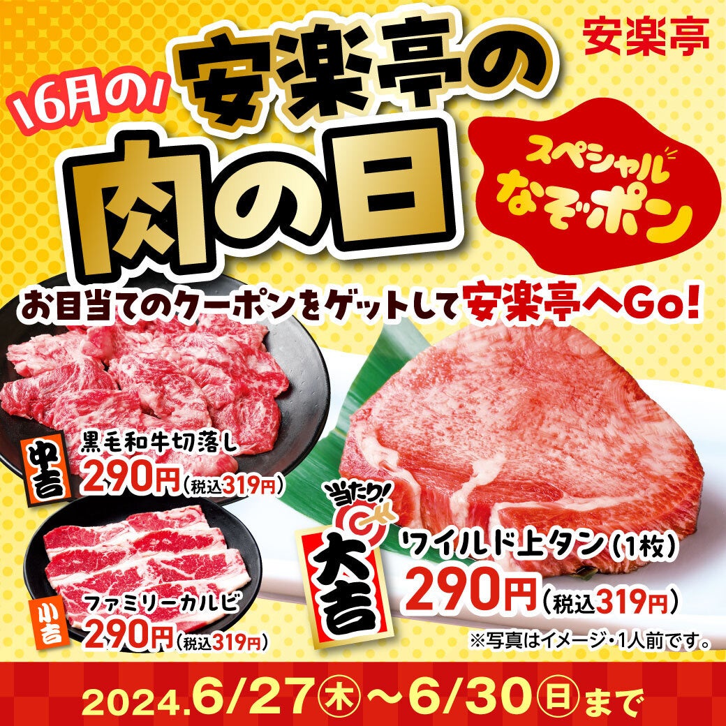 焼肉レストラン安楽亭(本社:埼玉県さいたま市 代表取締役:柳 先)は、2024年6月27日(木)~6月30日(日)の期間、安楽亭のWEBサイトや公式アプリから楽しめる抽選型クーポン「なぞポン」で、肉の日特別価格290円(税込319円)の焼肉が当たる「安楽亭の肉の日 スペシャルなぞポン」を開催します。