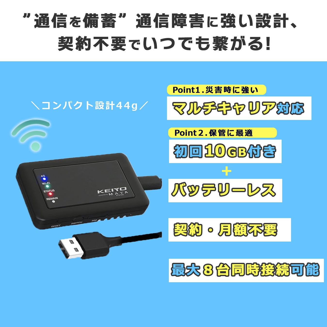 この備蓄型Wi-Fiルーターは、初回10GB/30日間付きで契約不要で電源をつけてすぐに使える手軽さが特徴。複数回線に対応しており、通信障害が発生しても安定した接続を確保できます。