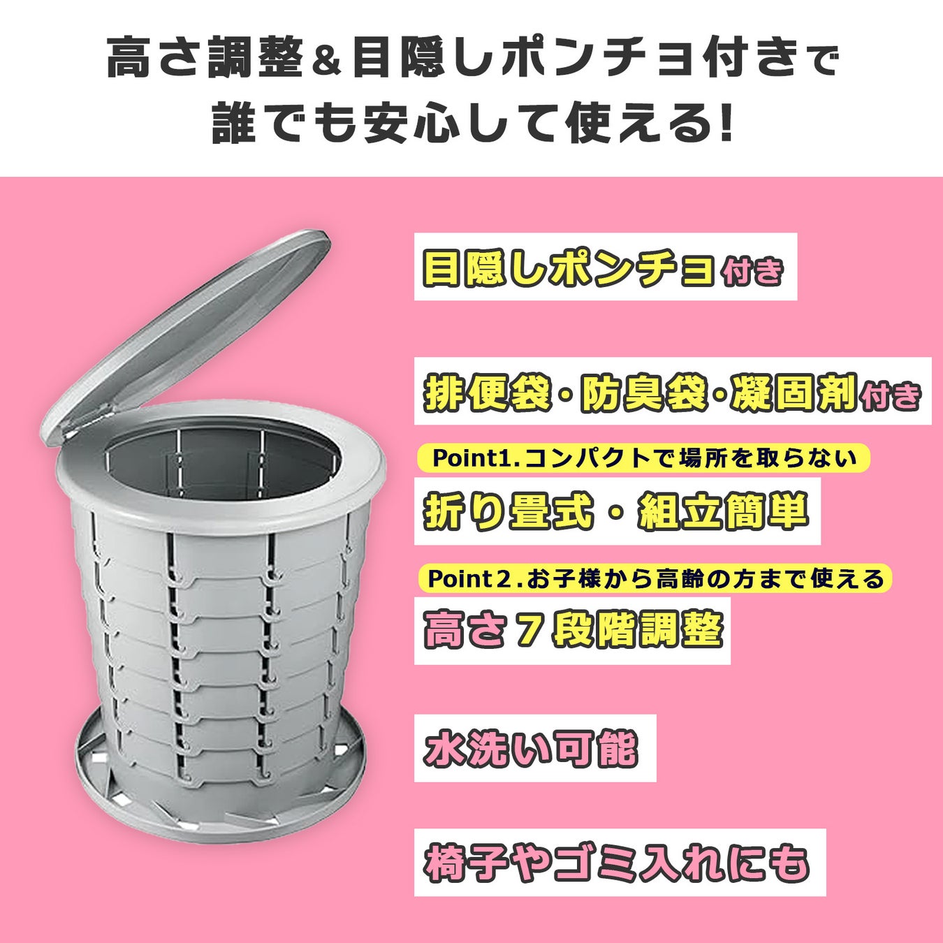 汚物袋+防臭袋の二重構造で臭い漏れを防ぎ、汚れても水洗い可能なプラスチック製なので衛生的です。目隠しポンチョや収納袋もセットになっており、これ一台で安心して備えることができます。